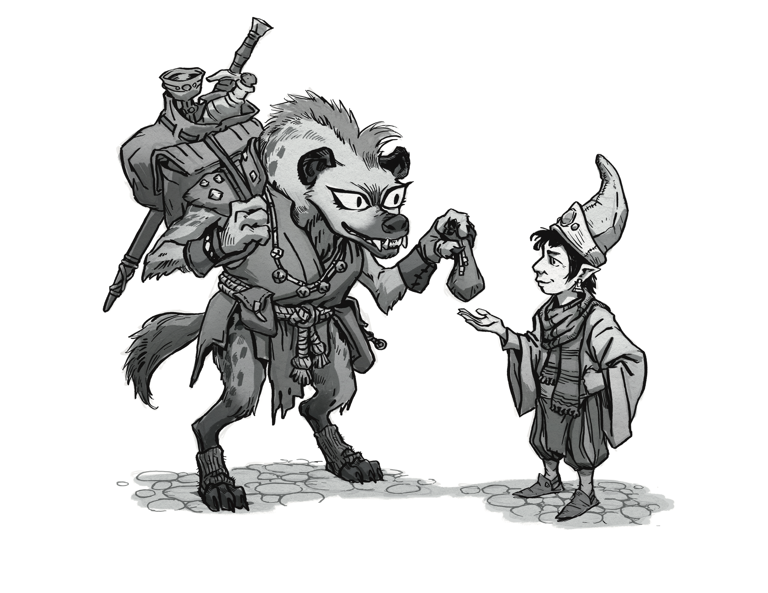 Hungry Gnoles Eat the Rich is a tabletop roleplaying game about disenfranchised hyena-folk eating their problems. The Island City-State of Taire has been overtaken by the Sylvan monarchy, and the gnoles have had enough. Gather resources, convert citizens to your cause, and topple the monarchy occupying the city.